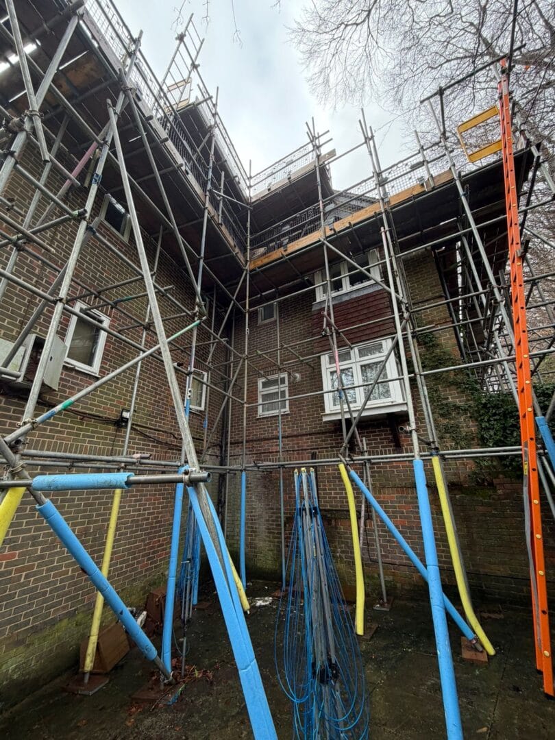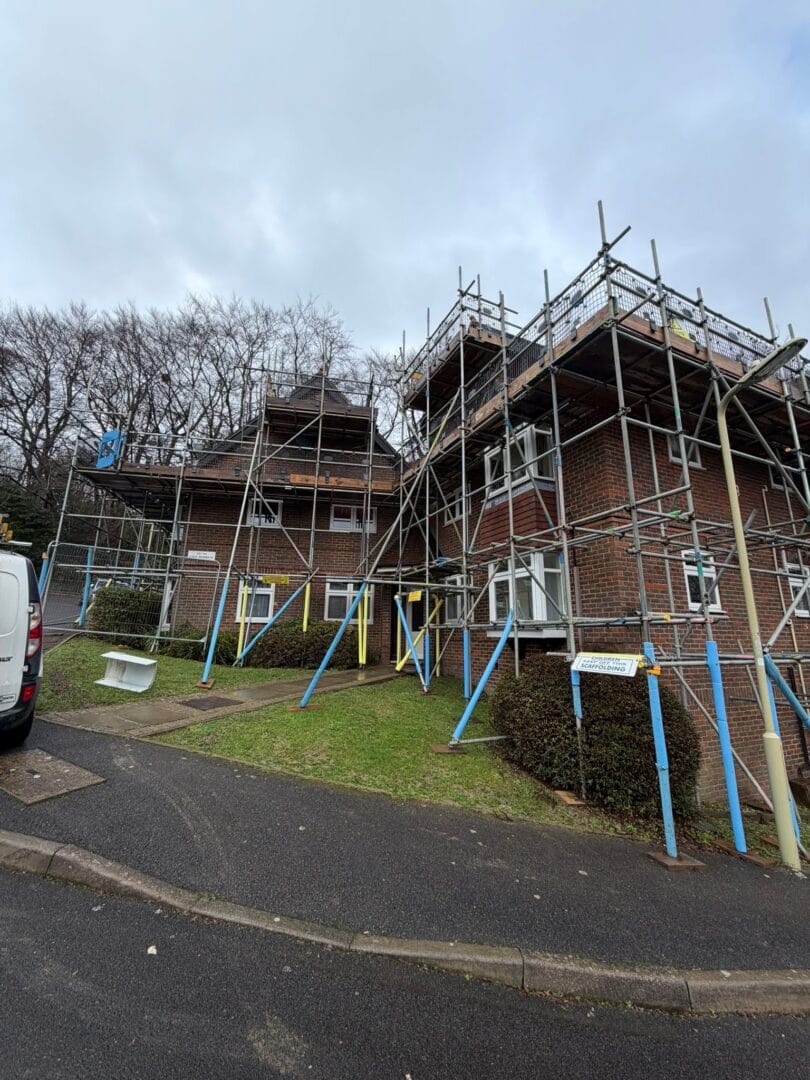The works involved the erection of scaffolding to a block of residential flats, providing safe and secure access to roof level for the duration of the roofing programme. Due to the property’s position on a gradual incline, careful planning was required to ensure stability, safe access and consistent working platforms across varying ground levels.