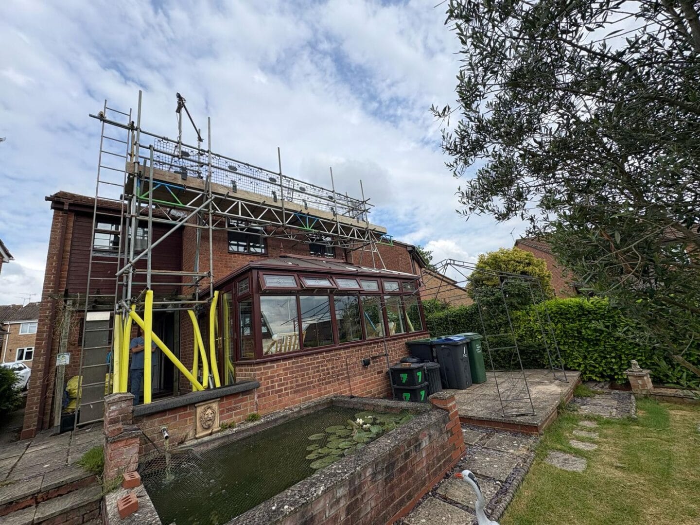 On larger schemes, particularly where roof renewal and solar installation are carried out together, temporary roof systems may be required. These structures provide full weather protection, allowing works to continue regardless of conditions.